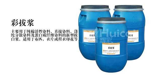 輝彩拔漿工活靈活,生產(chǎn)簡便,顏色鮮艷,拔白效果好,直接使染料消色,質(zhì)量穩(wěn)定。主要用于純棉活性染料,直接染料,滌綸分散染料及蛋白質(zhì)纖維染料的新型拔白漿,它適用于布匹,衣片或成衣印花等。